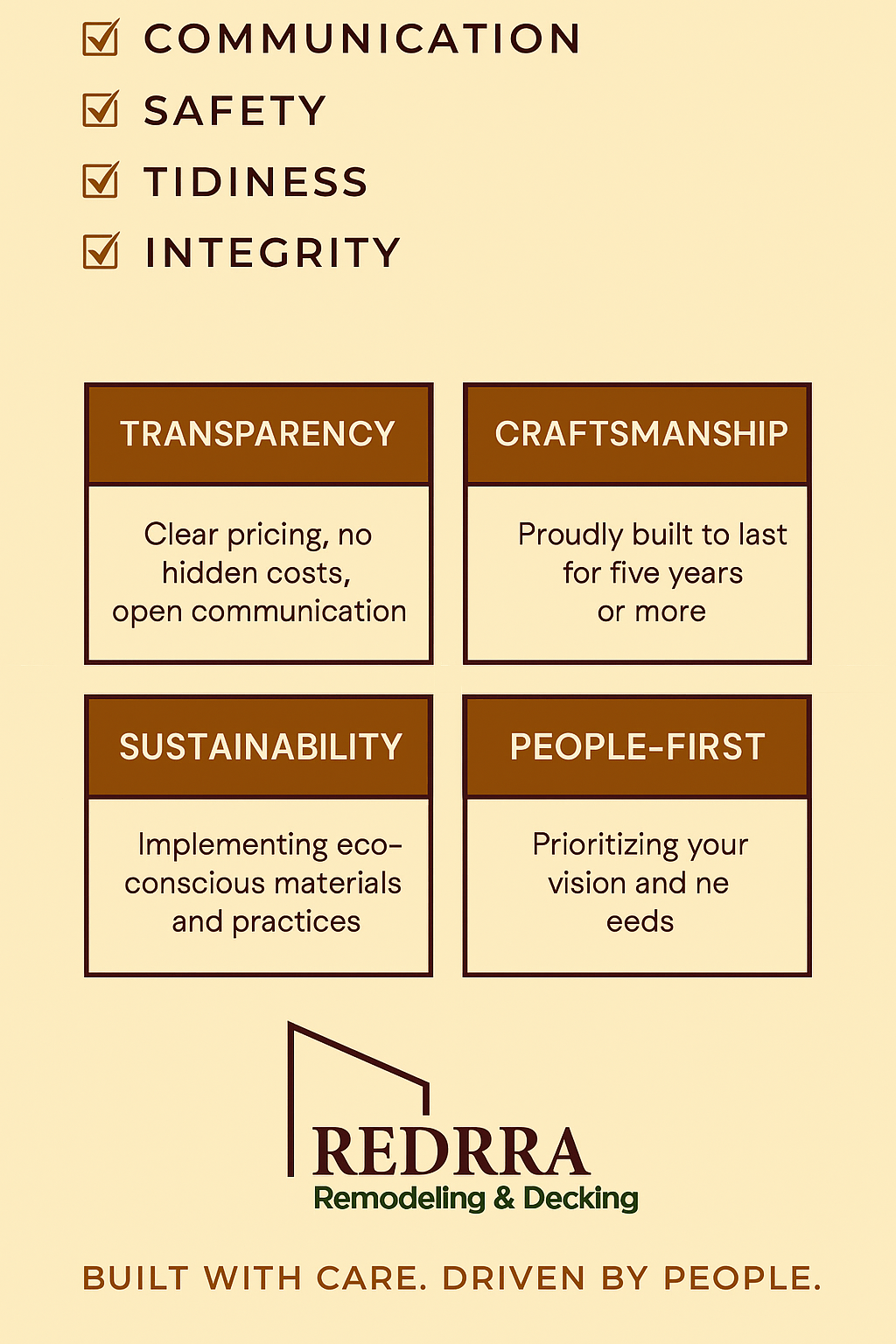 At Redrra Remodeling Deck & Railing Installation, we believe that every deck and railing we build is more than just wood and fasteners—it’s about people and purpose. Though we're a new business, we carry years of trade experience, fueled by clear values and an unwavering commitment to you.
